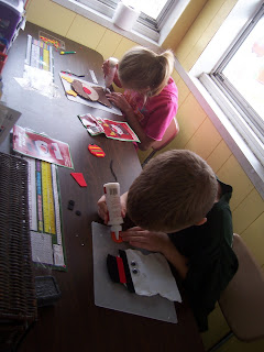 The next day, we made these puppets - which I adore!! The kids could totally do them on their own, once I tied a knot in their needles for them (so the string wouldn't fall out). They could look at the package, and figure out which pieces needed to be glued onto which parts - and they came out so cute! On Jake's (Santa) we had to use cotton balls for a beard because it didn't come with his beard for some reason. For a buck, though, I can't complain. This is a totally kid-independent (you'll note that I was actually able to take photos of them doing this one) project, and I give it two thumbs way up!