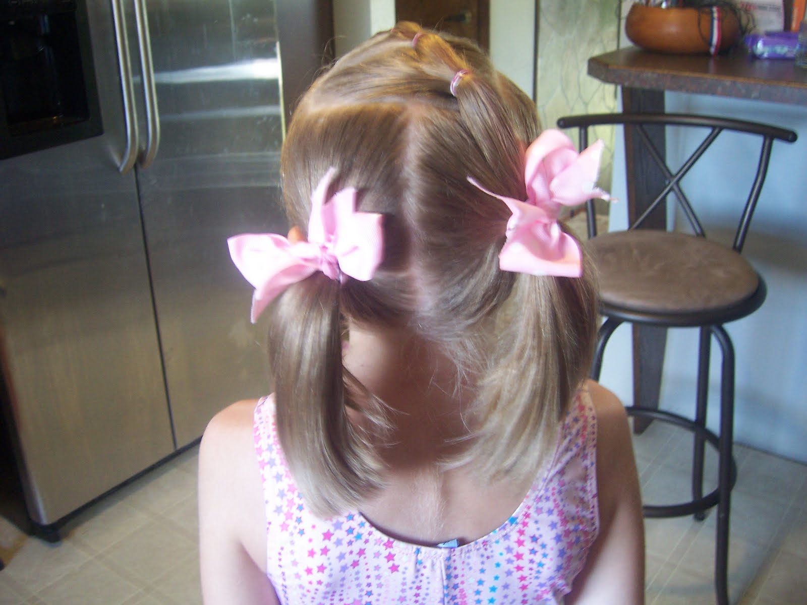 I have found that many moms who blog their "toddler styles" are easy to change up a bit for older girls with short hair. This mama has beautiful little red heads, and I got this idea from her: http://redpunzel.blogspot.com/2010/07/side-pony-and-braid.html Here is how our's turned out: